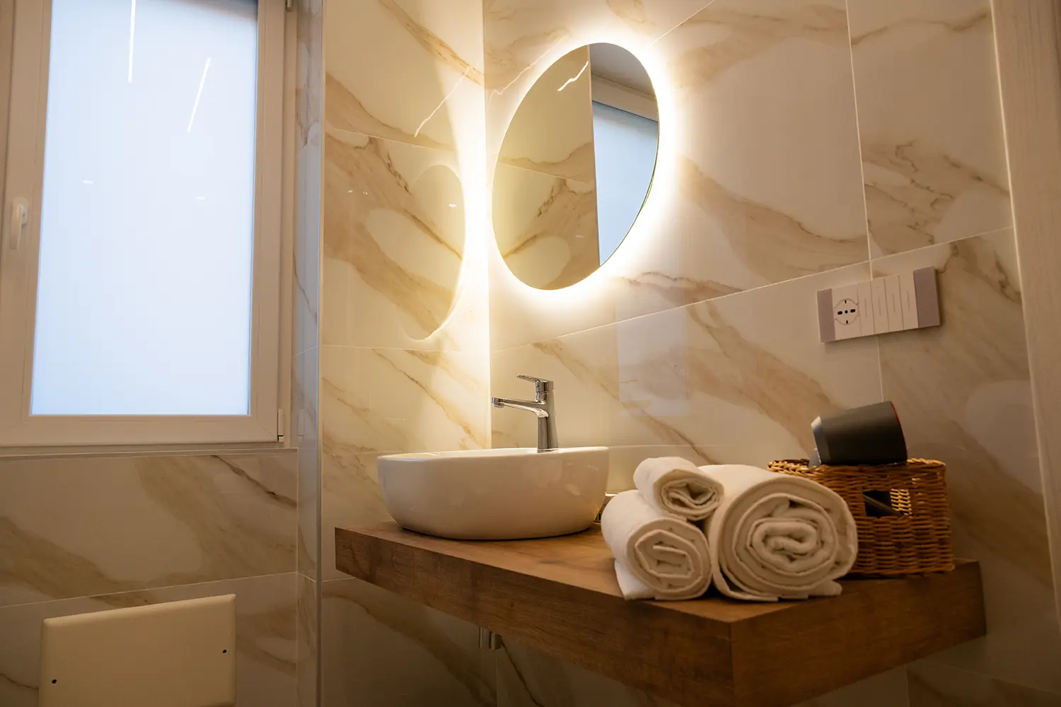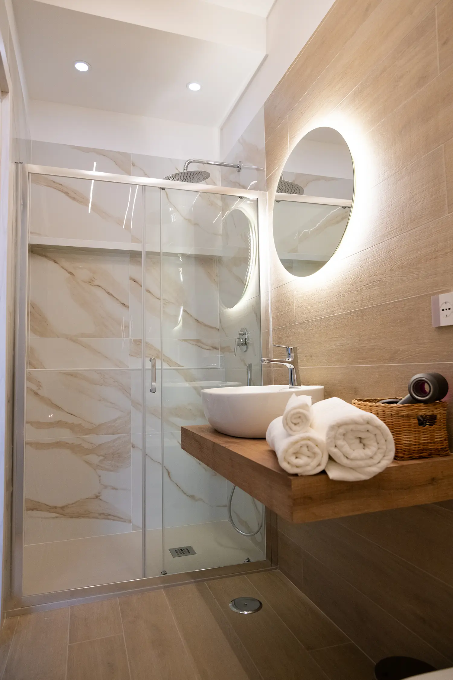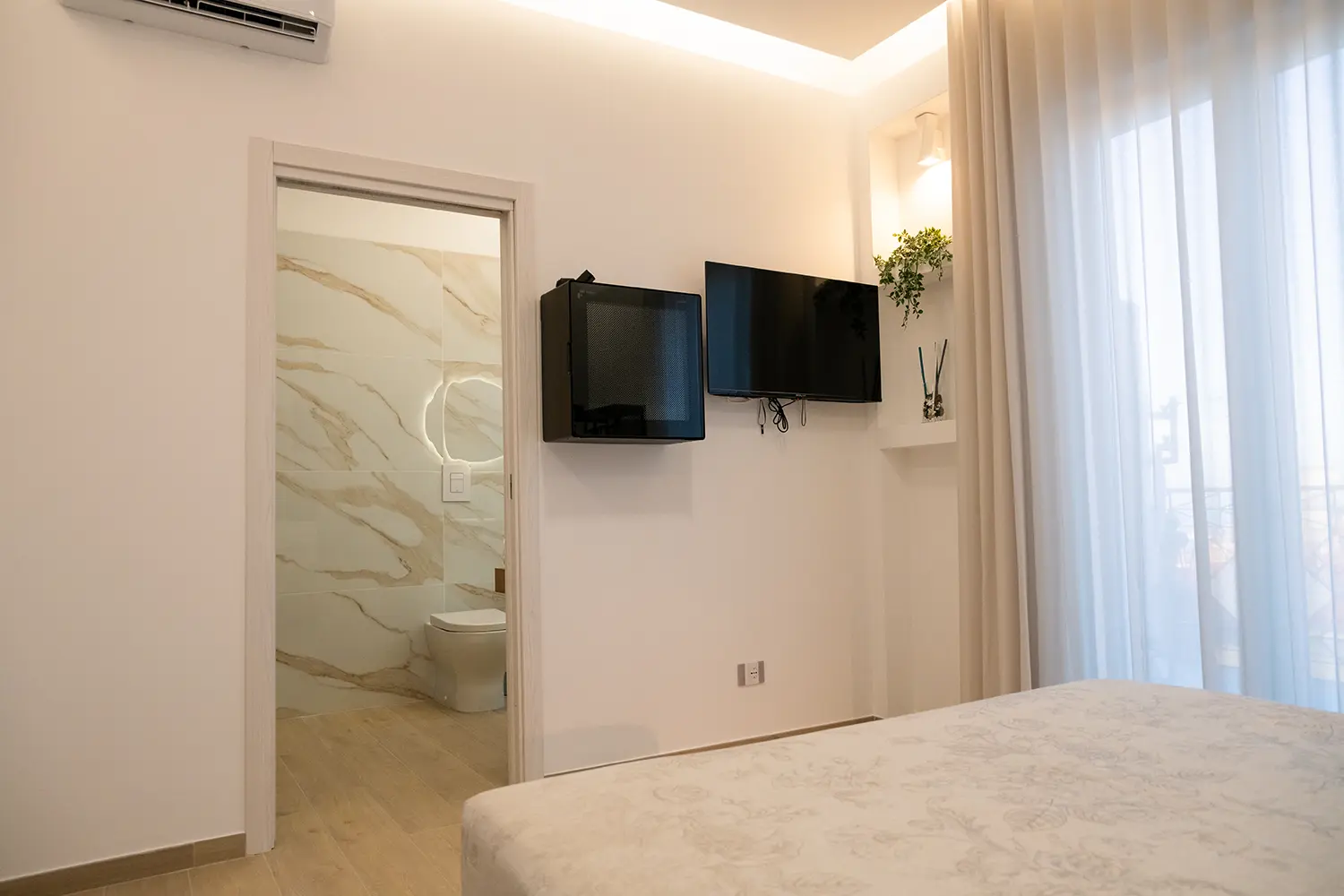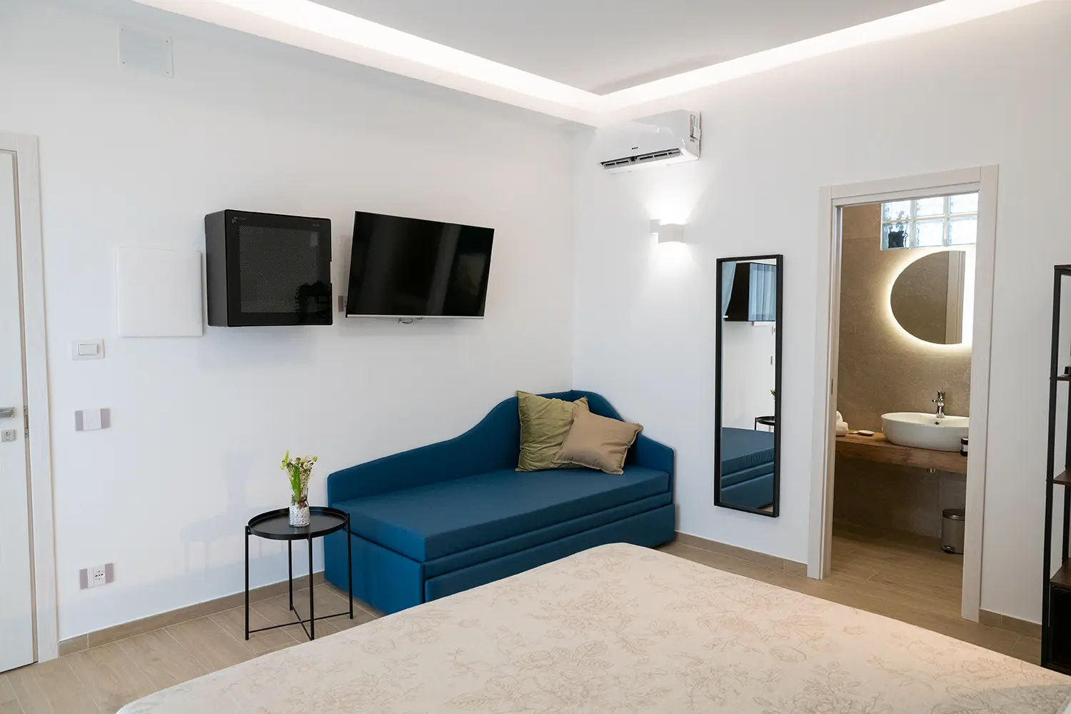 Comprende letto matrimoniale king size e divano letto, ampio bagno privato, tv, condizionatore, frigobar, armadio e bollitore.