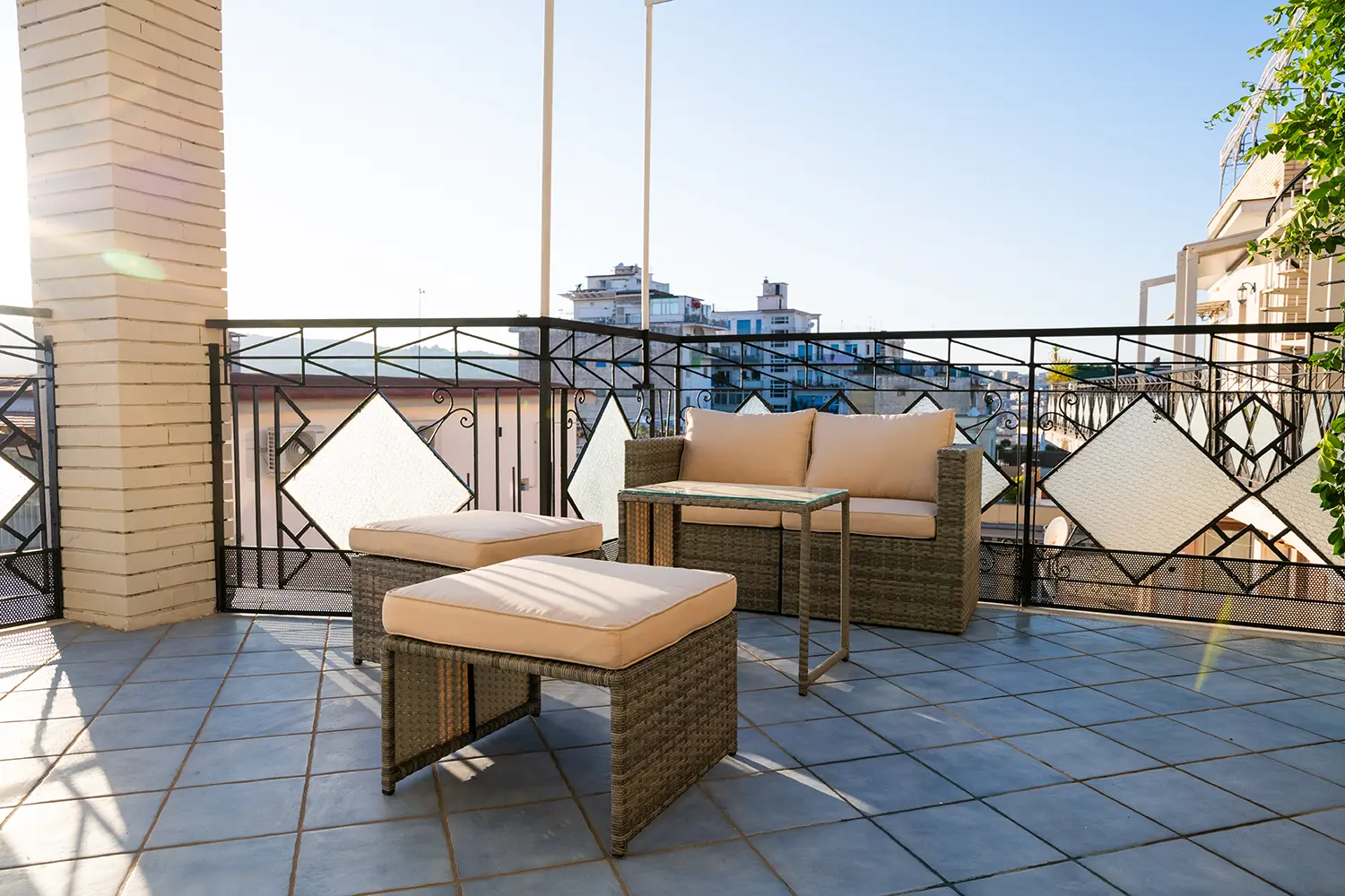 Camera luminosa ed ampia, con balcone privato arredato con divanetti e tavolino.