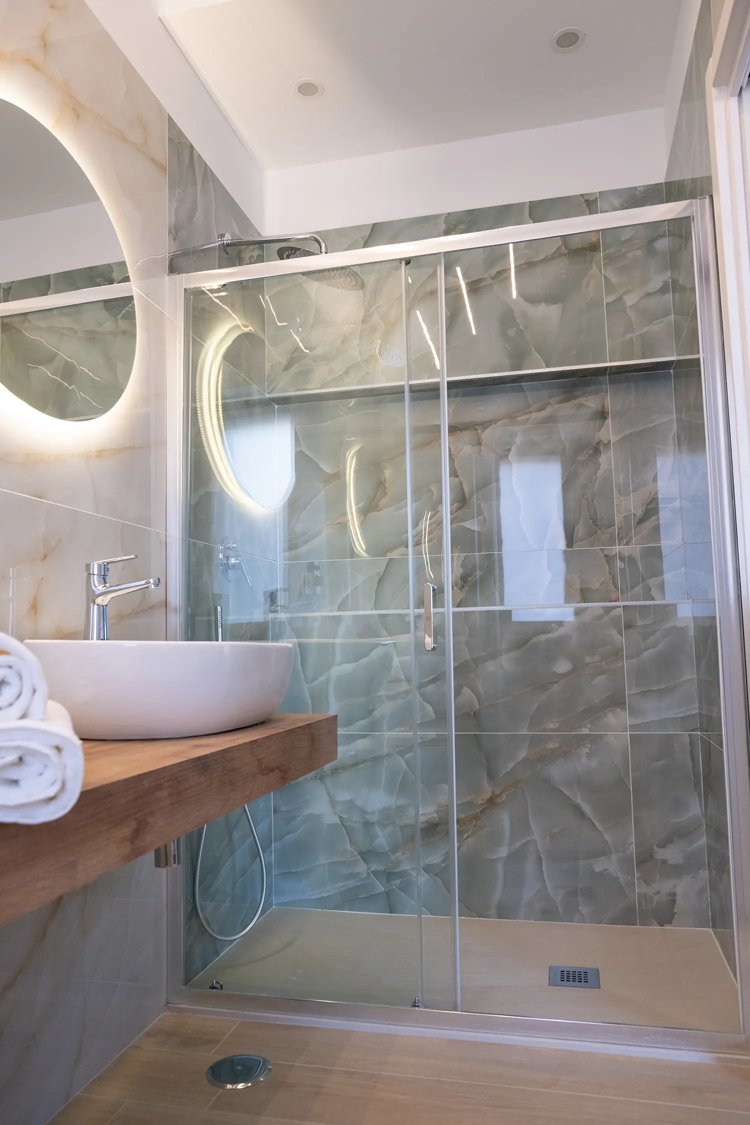 Due luminose finestre consentono l’accesso all’ampio balcone, corredato di divanetti e tavolino per godersi il panorama vista mare.