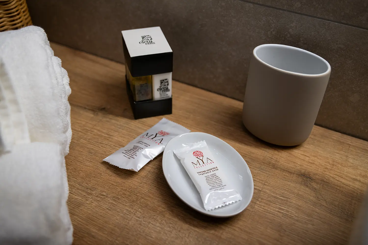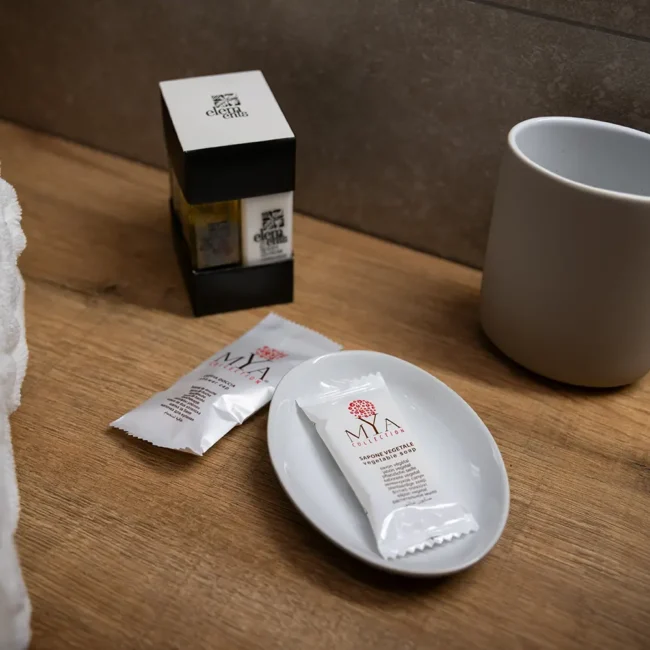 È inoltre dotata di tv, condizionatore, frigobar, armadio e bollitore.