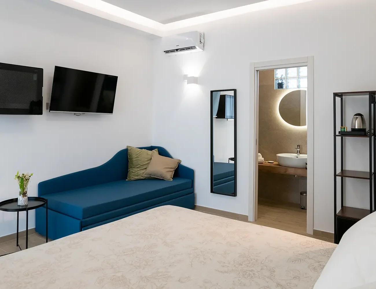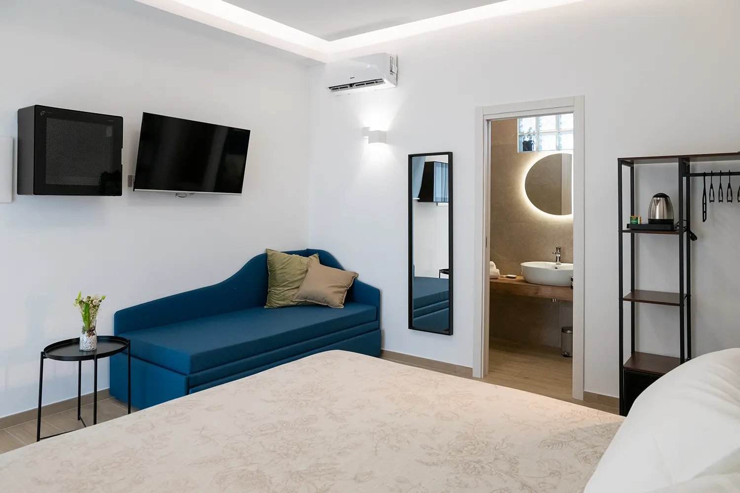 Comprende letto matrimoniale king size e divano letto, ampio bagno privato, tv, condizionatore, frigobar, armadio e bollitore.