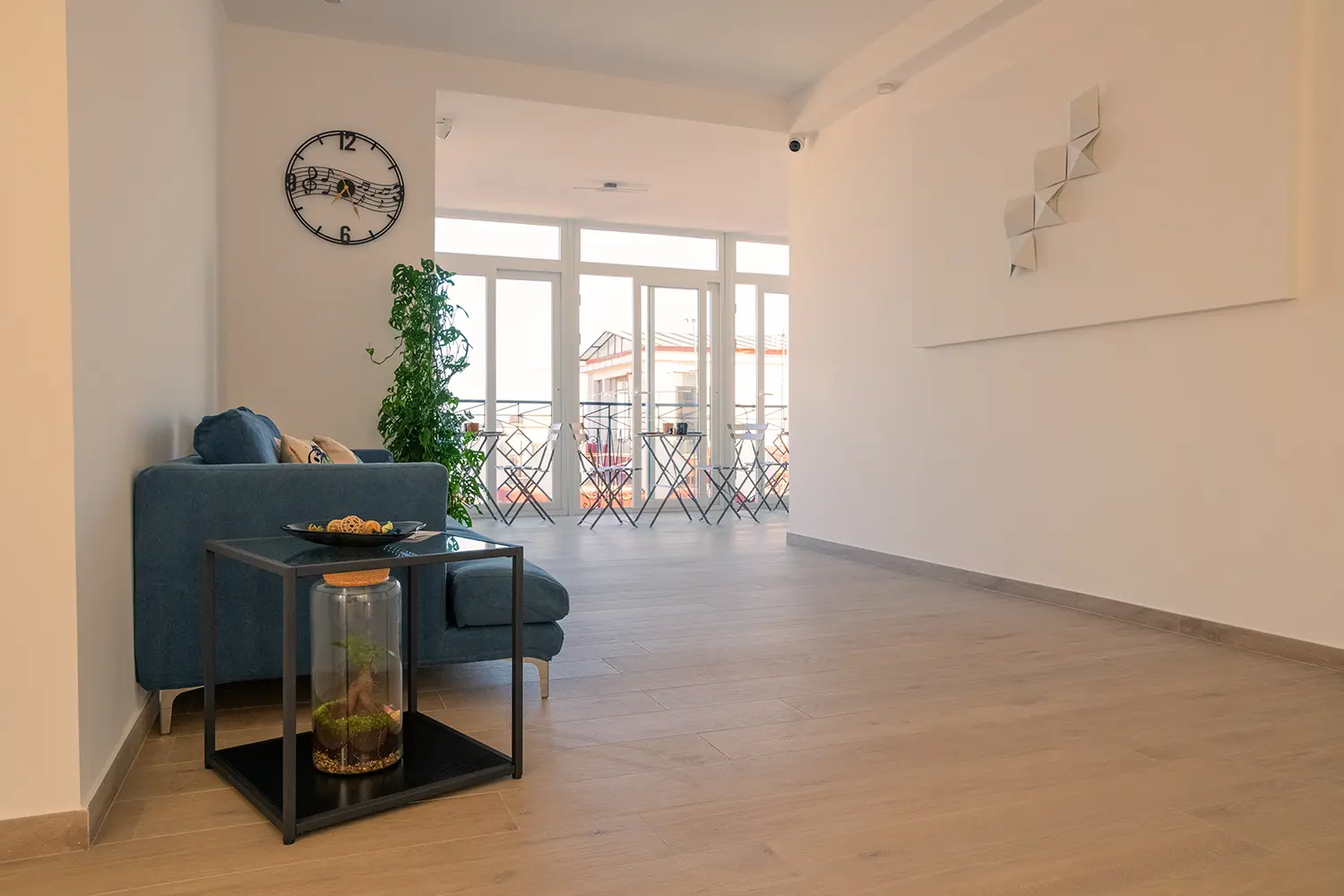 Camera luminosa ed ampia, con balcone privato arredato con divanetti e tavolino.