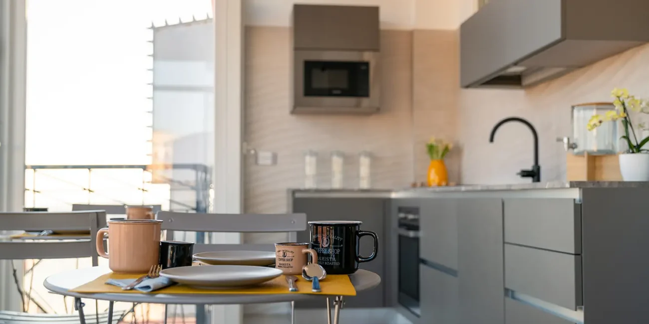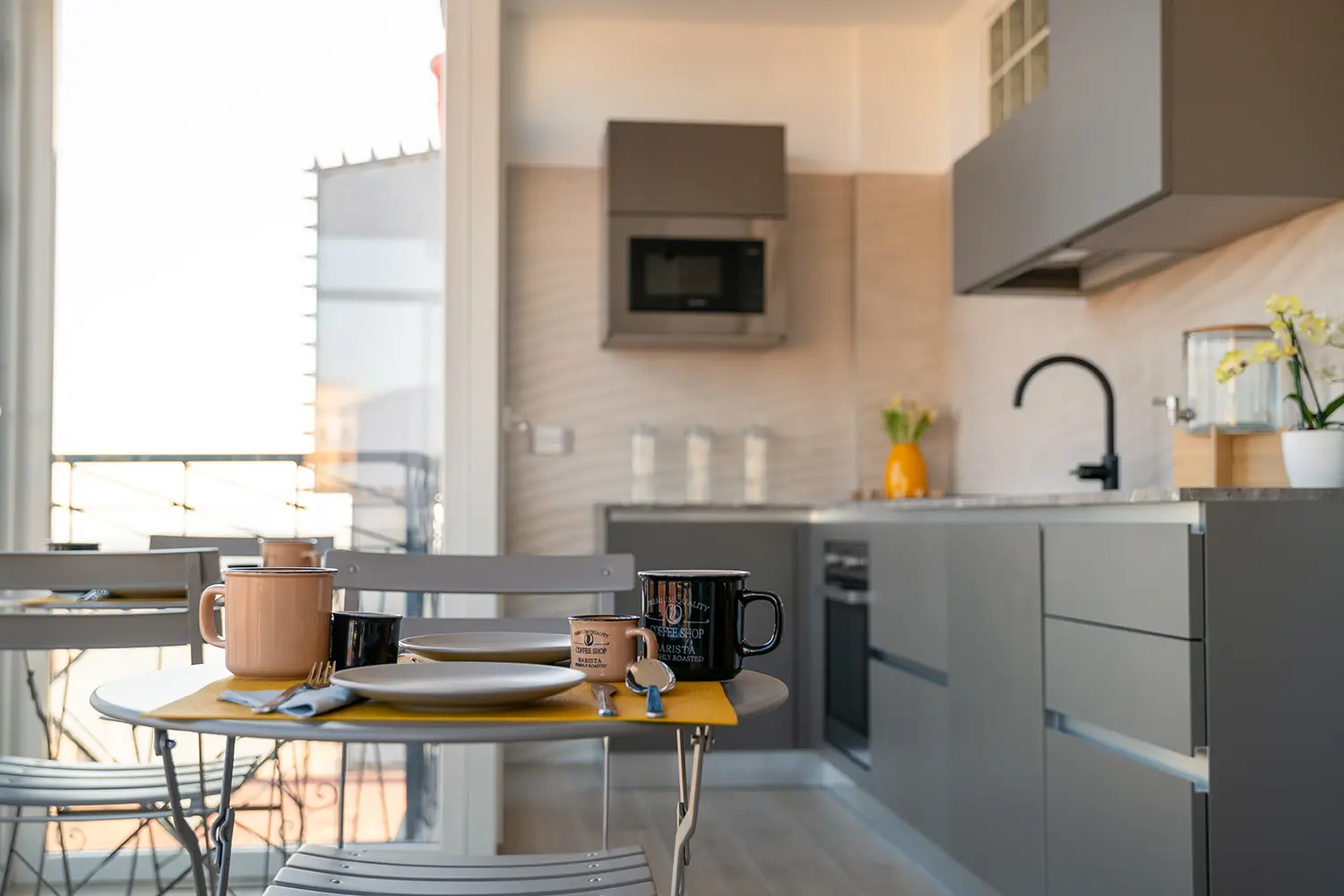 Due luminose finestre consentono l’accesso all’ampio balcone, corredato di divanetti e tavolino per godersi il panorama vista mare.