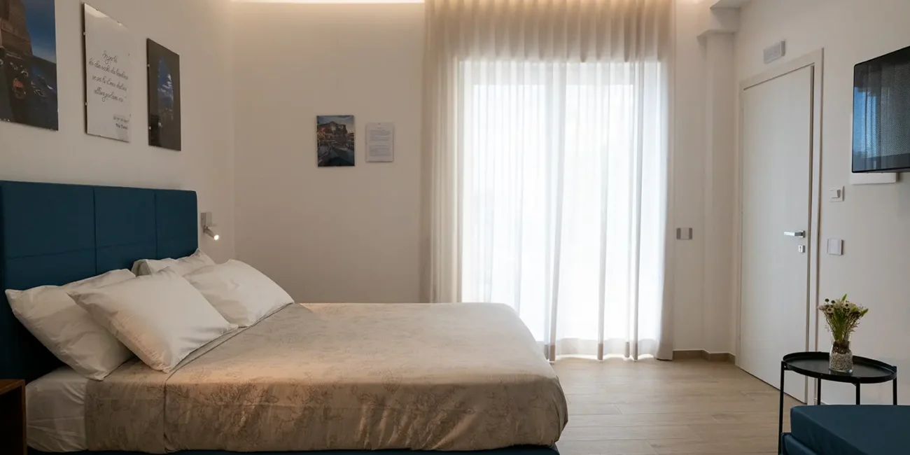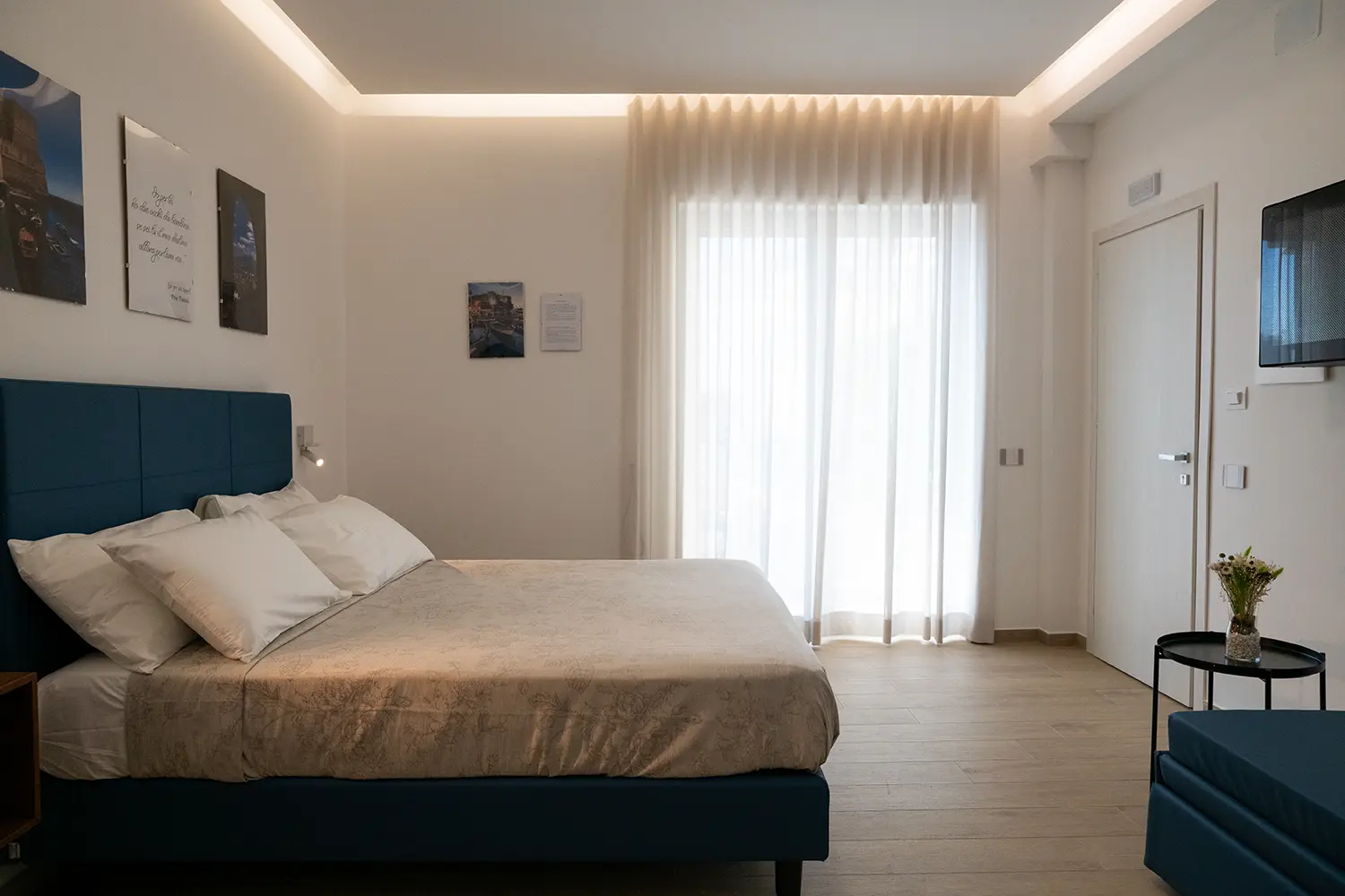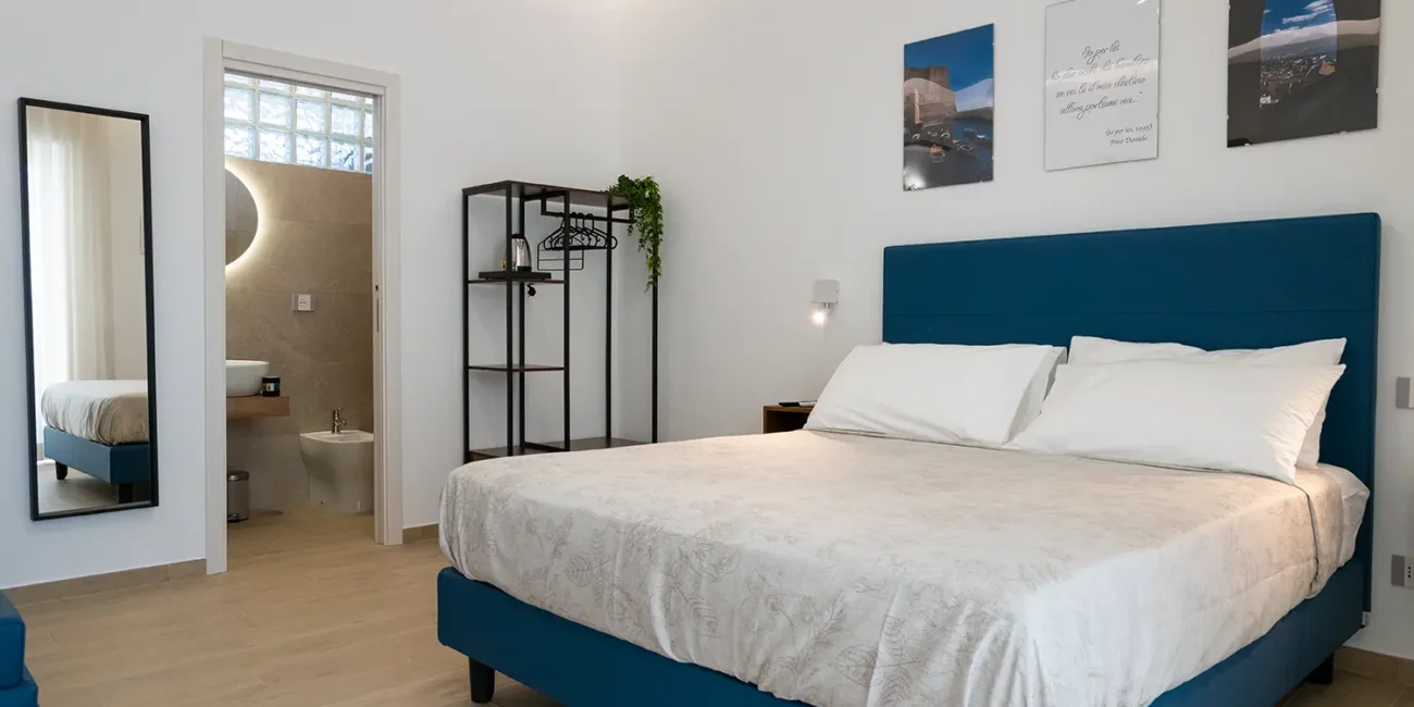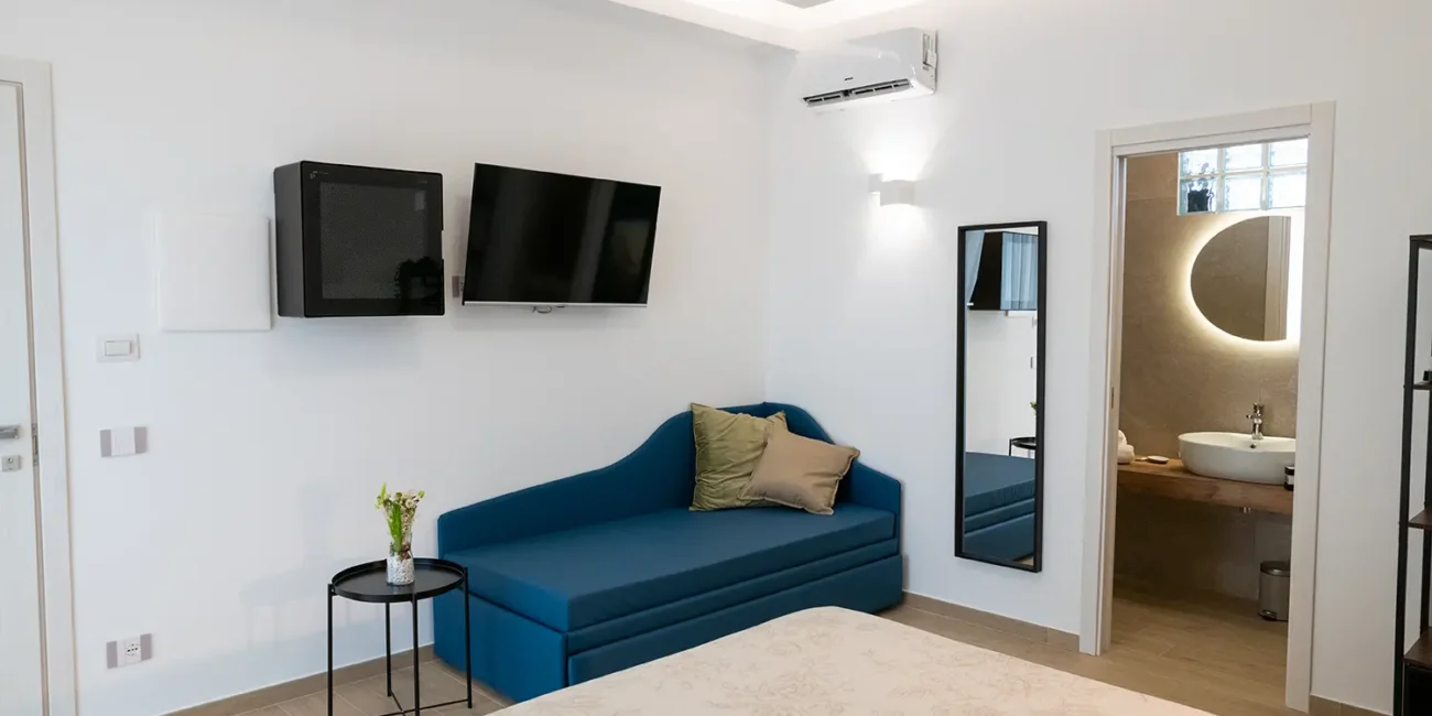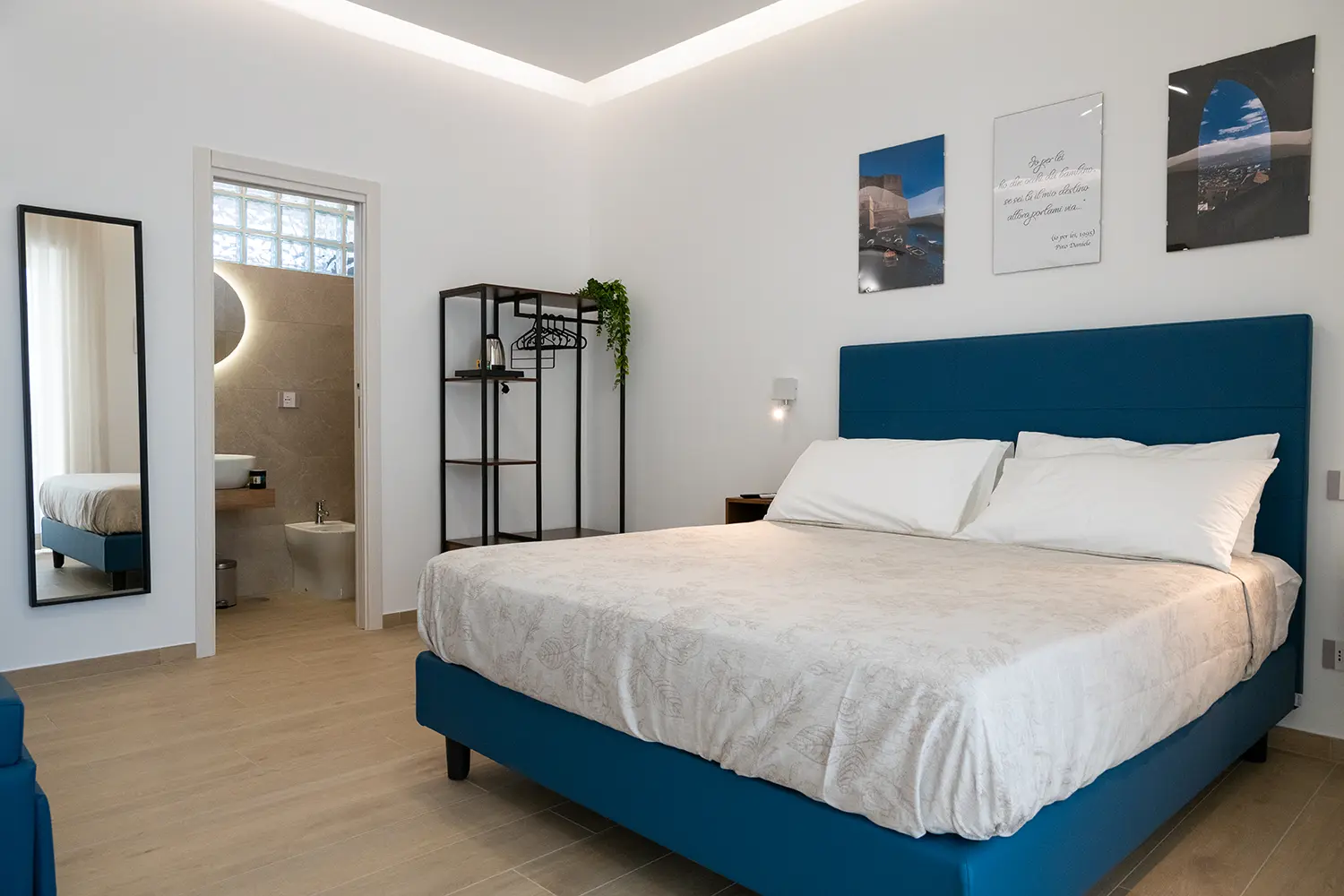Comprende letto matrimoniale king size e divano, ampio bagno privato, tv, condizionatore, frigobar, armadio e bollitore.