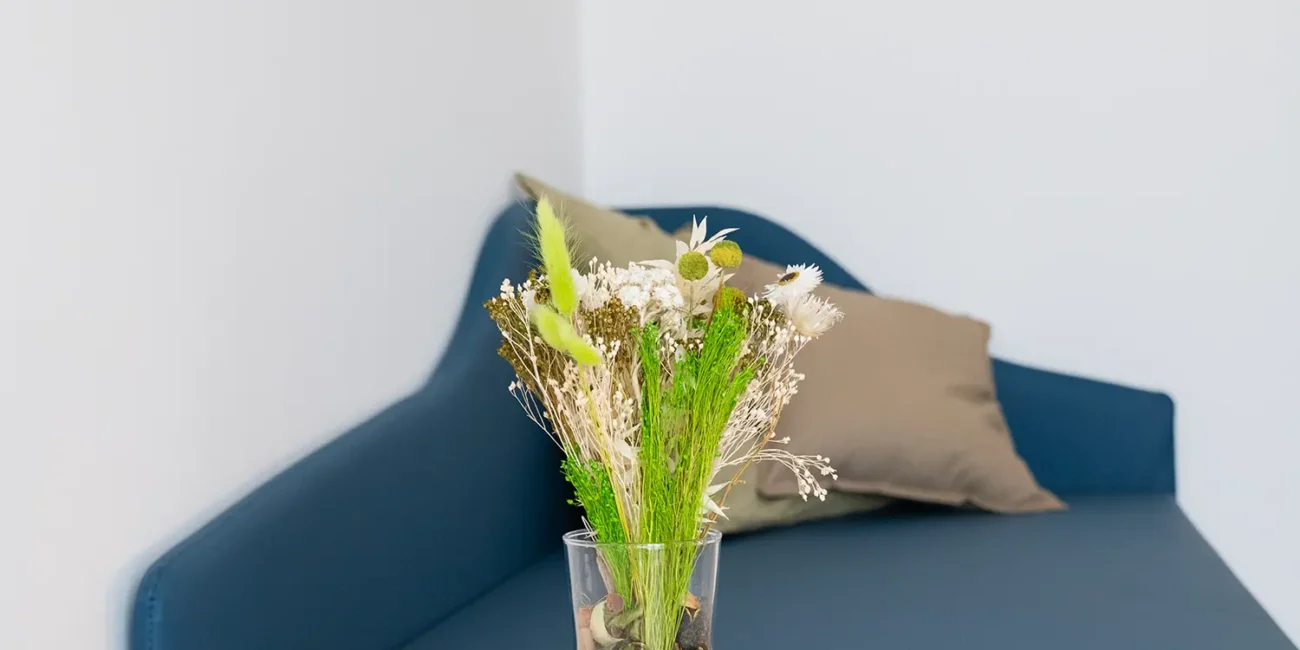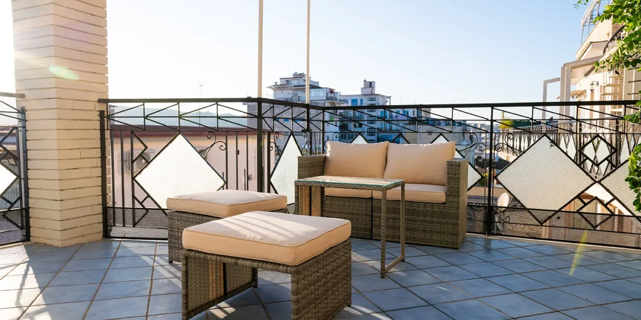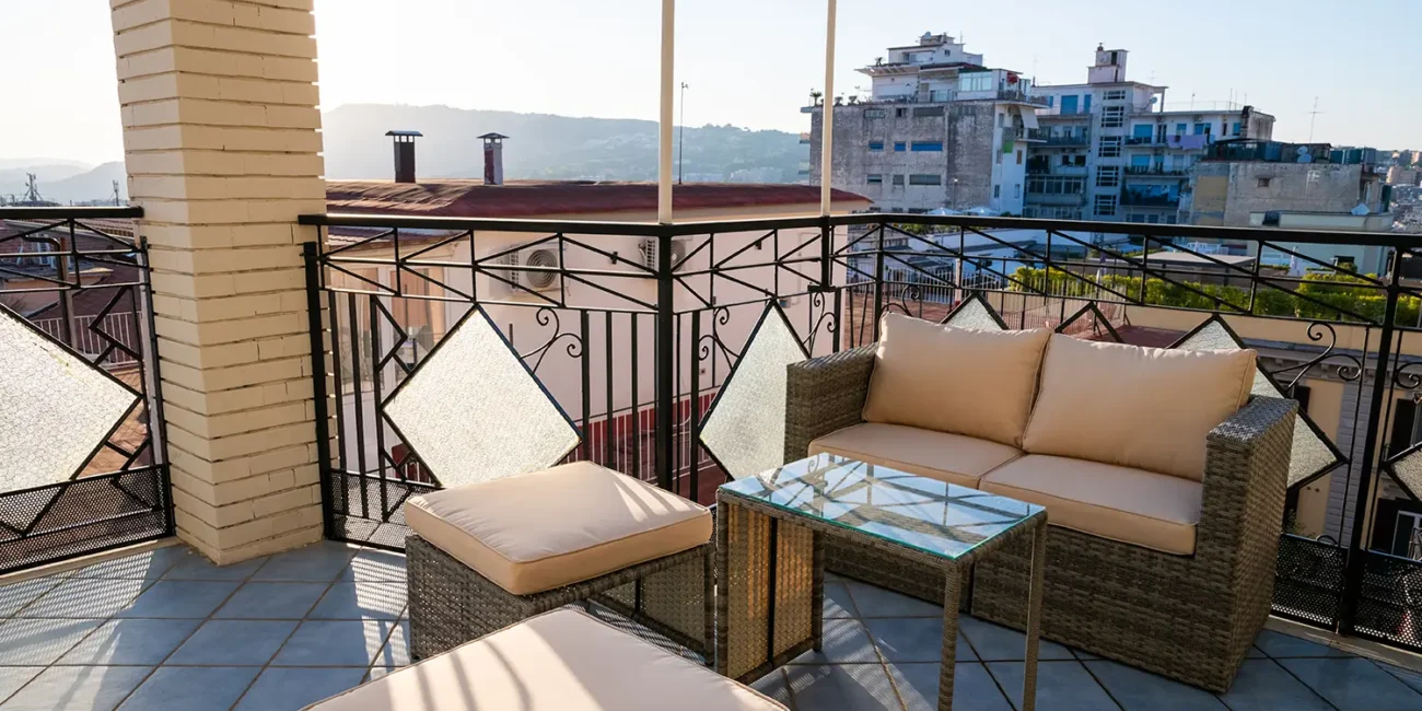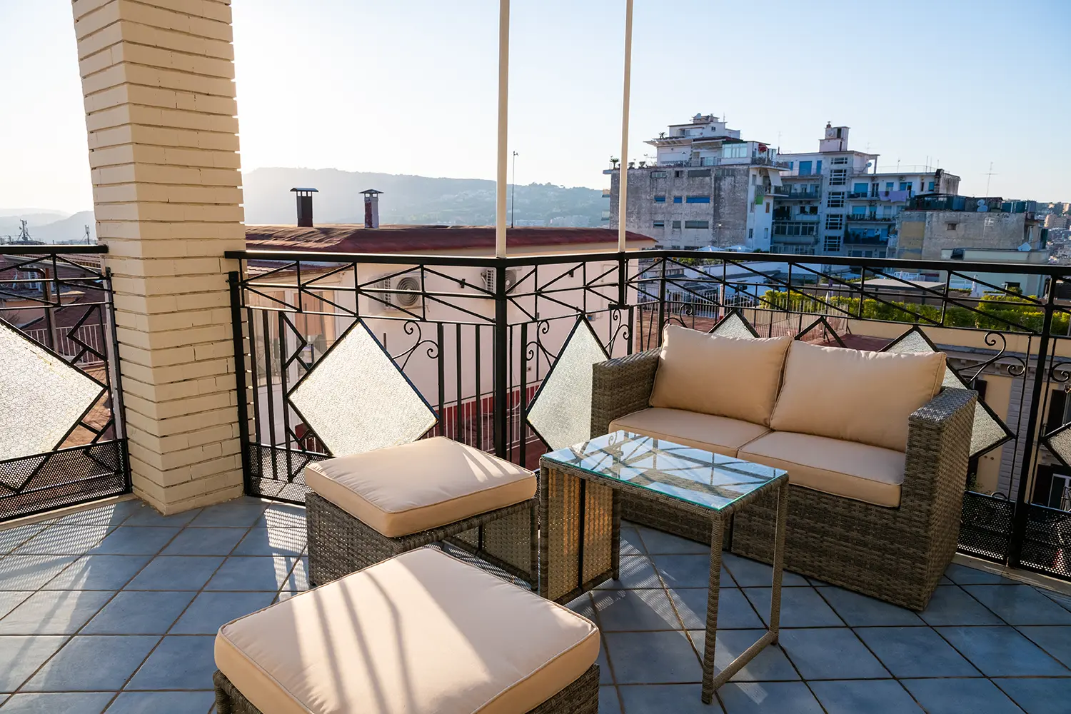 Camera luminosa ed ampia, con balcone privato arredato con divanetti e tavolino.
