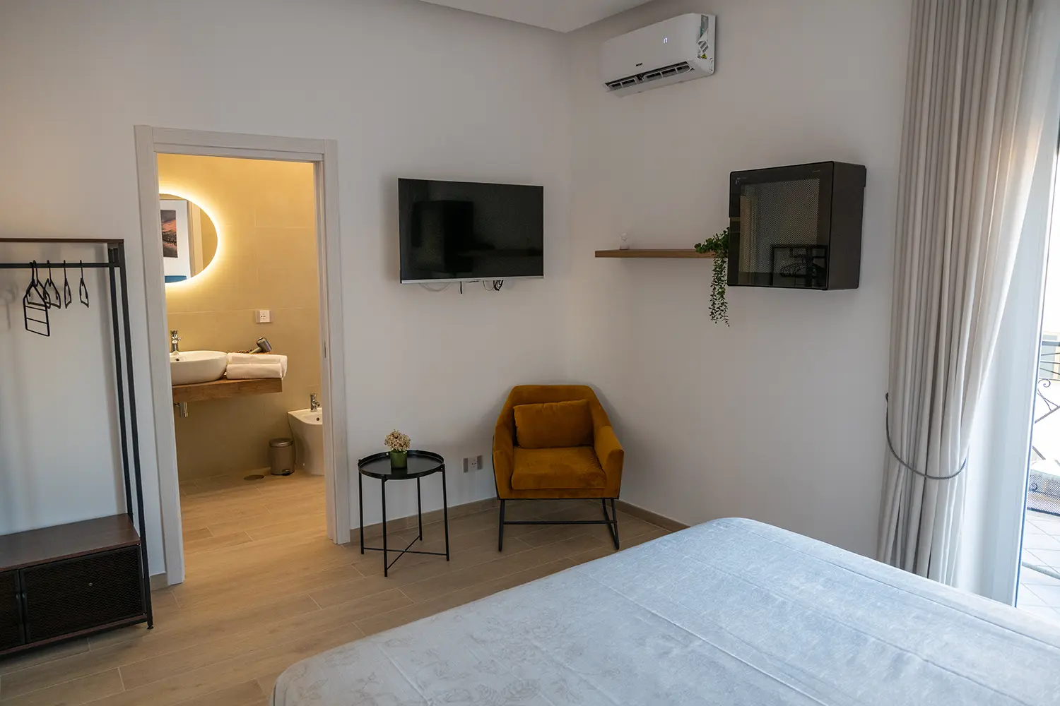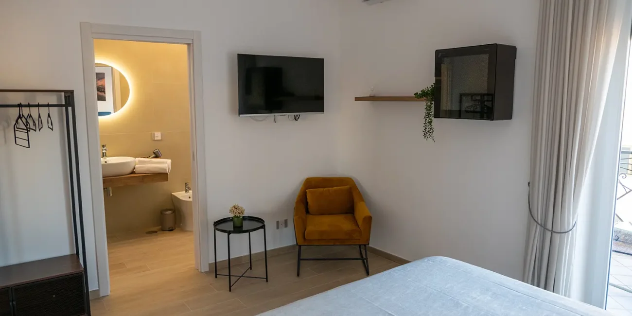 È presente un’ampia finestra che la rende molto luminosa ed è dotata di tv, condizionatore, bagno privato, frigobar, armadio e bollitore.