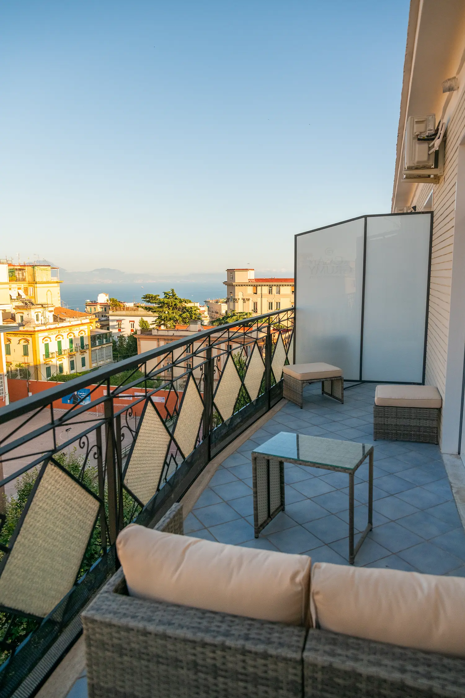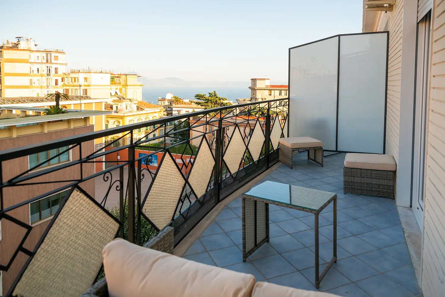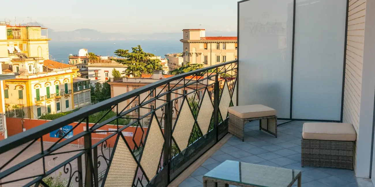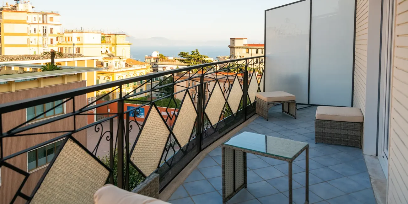 Ampia camera con balcone privato vista mare provvisto di divanetti, con letto matrimoniale, poltrona, bagno privato.