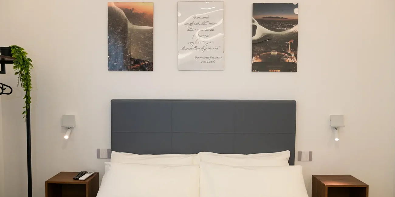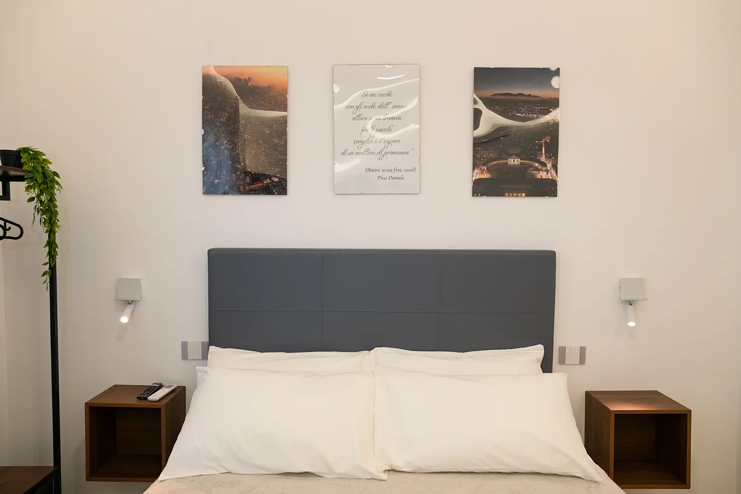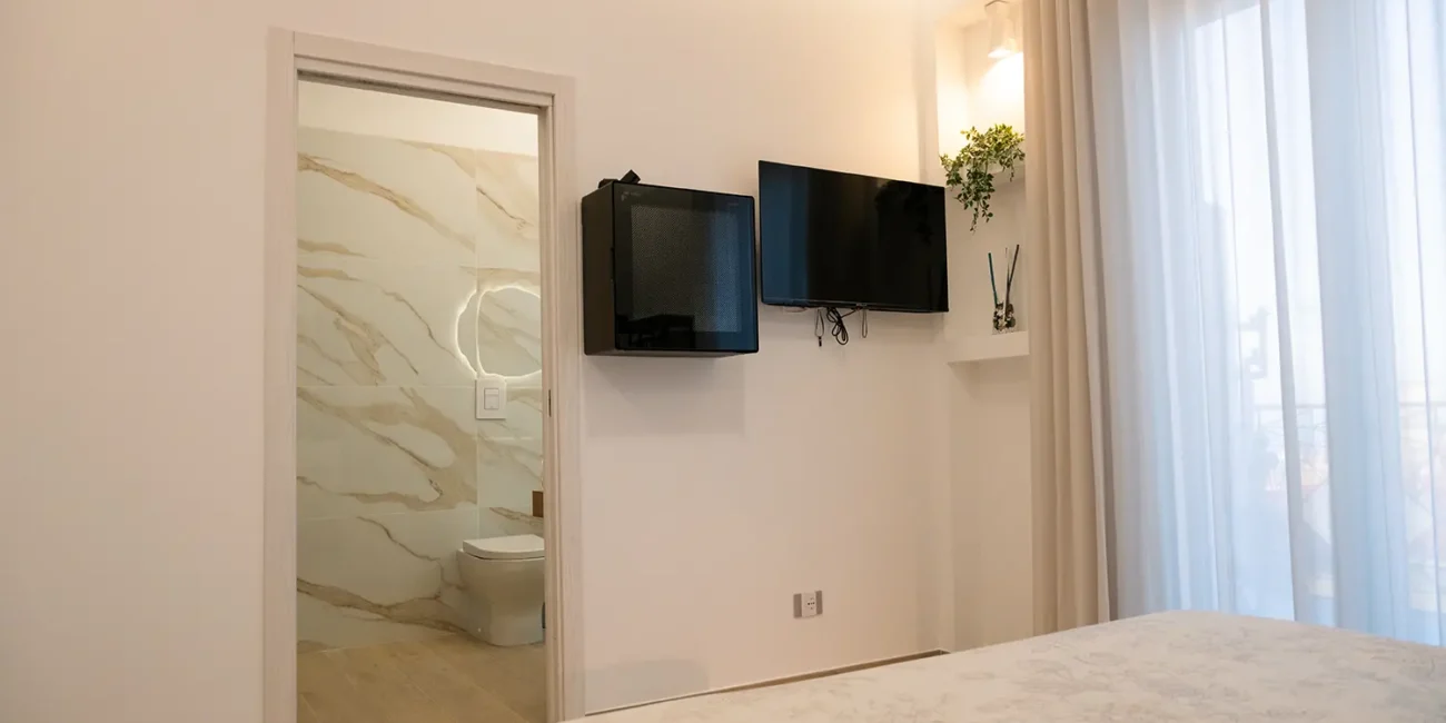 È inoltre dotata di tv, condizionatore, frigobar, armadio e bollitore.La ampia finestra la rende molto luminosa.